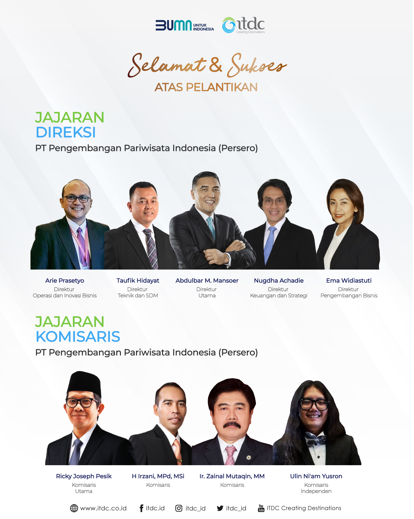 Sesuai Surat Keputusan (SK) Menteri BUMN Nomor: SK-363/MBU/112020 tanggal 13 November 2020 tentang Pemberhentian, Perubahan Nomenklatur, dan Pengangkatan Anggota-Anggota Dewan Direksi Perusahaan Perseroan (Persero) PT Pengembangan Pariwisata Indonesia, Pemegang Saham mengangkat kembali Abdulbar M. Mansoer sebagai Direktur Utama Perseroan dan mengangkat nama-nama berikut sebagai Anggota Dewan Direksi ITDC: Nugdha Achadie sebagai Direktur Keuangan dan Strategi, Taufik Hidayat sebagai Direktur Teknik dan SDM, Ema Widiastuti sebagai Direktur Pengembangan Bisnis, serta Arie Prasetyo sebagai Direktur Operasi dan Inovasi Bisnis.