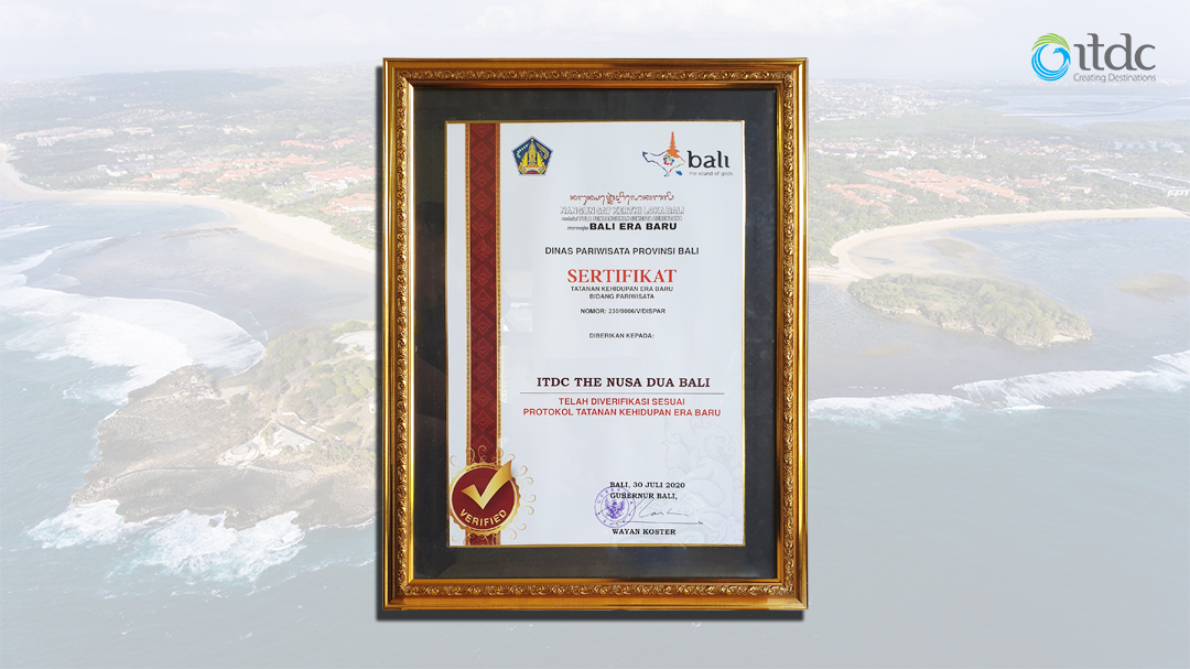 Sertifikasi Tatanan Kehidupan Era Baru untuk Kawasan Nusa Dua tersebut diserahkan oleh Gubernur Bali Wayan Koster kepada Dirut ITDC pada seremoni Deklarasi Program Kepariwisataan dalam Tatanan Kehidupan Bali Era Baru dan Digitalisasi Pariwisata berbasis QRIS yang digelar di The Nusa Dua, Bali pada hari Kamis (30/7/2020). Hadir pada kegiatan Deklarasi tersebut antara lain Menteri Koordinator Bidang Kemaritiman dan Investasi Luhut Binsar Pandjaitan, Menteri Pariwisata dan Ekonomi Kreatif Wishnutama Kusubandio, Gubernur Bali Wayan Koster serta Wakil Gubernur Bali Tjokorda Oka Artha Ardana Sukawati, Kepala Kantor Perwakilan Bank Indonesia Bali Trisno Nugroho, Pangdam IX/ Udayana Mayor Jenderal TNI Kurnia Dewantara, serta Kapolda Bali Irjen Pol. Dr. Petrus Reinhard Golose.