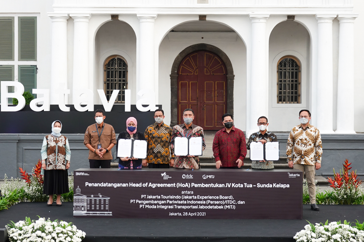 Jakarta. Rabu 28 April 2021 menjadi momen terlaksananya kolaborasi pengelolaan kawasan Kota Tua-Sunda Kelapa melalui terbentuknya Joint Venture (JV) yang dilakukan Jakarta Experience Board/PT Jakarta Tourisindo (JXB), PT Pengembangan Pariwisata Indonesia (Persero) atau dikenal sebagai Indonesia Tourism Development Corporation (ITDC), dan PT Moda Integrasi Transportasi Jabodetabek (MITJ).