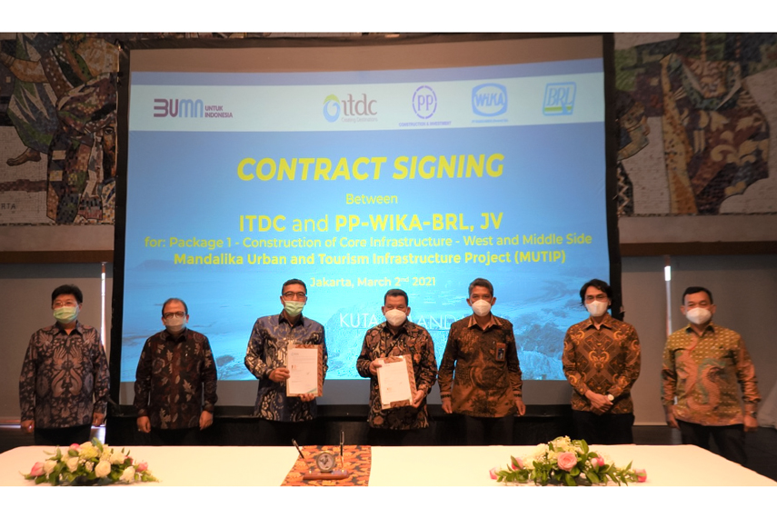 Jakarta, 02 Maret 2021-- Percepatan pengembangan Kawasan Ekonomi Khusus (KEK) Pariwisata Mandalika atau The Mandalika terus berjalan. PT Pengembangan Pariwisata Indonesia (Persero) atau Indonesia Tourism Development Corporation (ITDC), BUMN pengembang kawasan The Mandalika, memastikannya dengan ditandatanganinya 2 (dua) Kontrak Paket Pekerjaan Konstruksi Mandalika Urban Tourism Infrastructure Project (MUTIP) yaitu Paket I dan Paket II, senilai total Rp1,7 Triliun.  Melalui penandatanganan kontrak ini, ITDC memastikan proyek MUTIP tetap berjalan sesuai rencana awal, di tengah masih berlangsungnya pandemi global COVID-19.