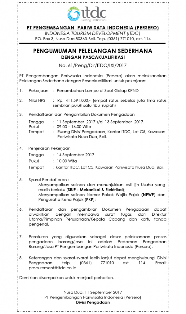 ANNOUNCEMENT OF SIMPLE AUCTION WITH POST QUALIFICATION - ADDITION OF LIGHTS IN THE DARK SPOT OF KPND