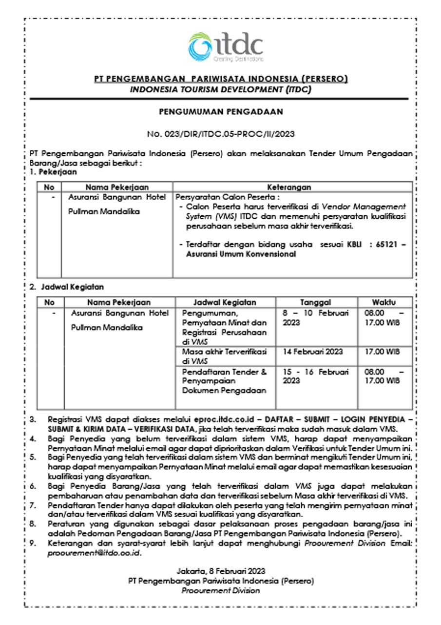 PENGUMUMAN PENGADAAN No. 023/DIR/ITDC.05-PROC/II/2023