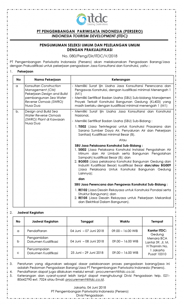 ANNOUNCEMENT OF GENERAL SELECTION AND GENERAL AUCTION WITH PRAKUALIFICATION No. 080 / Peng / Dir / ITDC / V / 2018