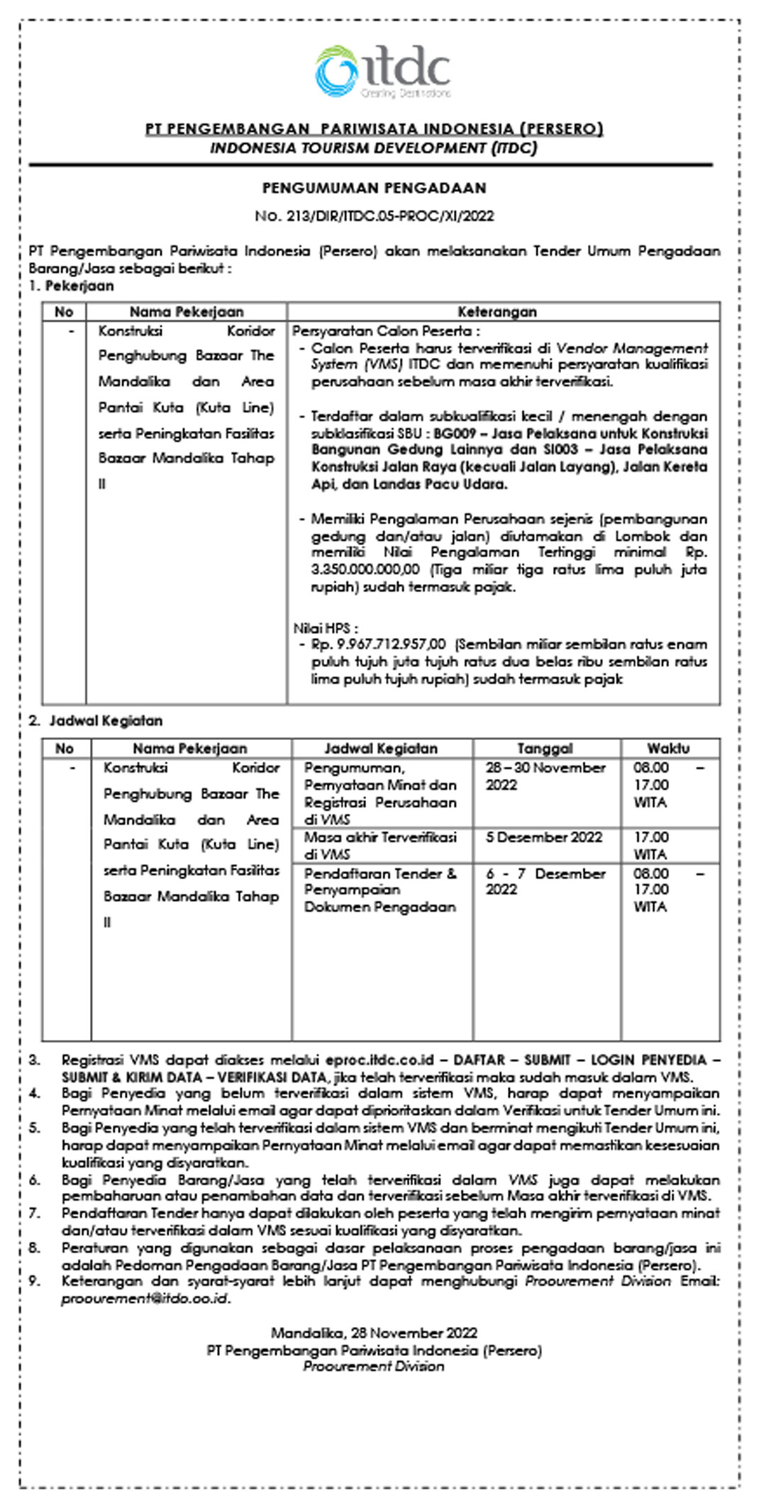 PENGUMUMAN PENGADAAN No. 213/DIR/ITDC.05-PROC/XI/2022