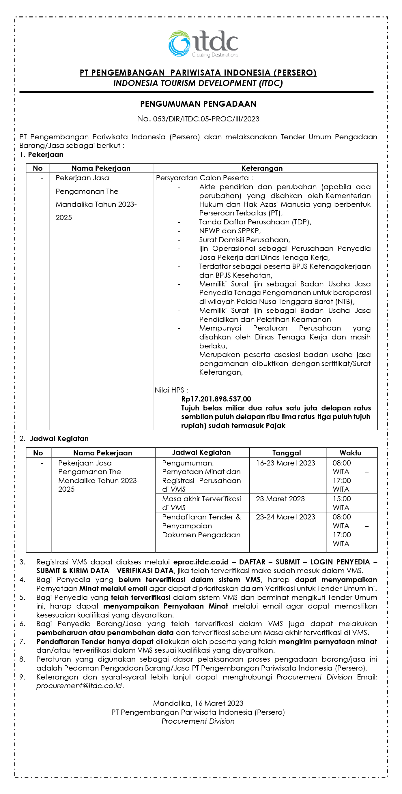 PENGUMUMAN PENGADAAN No. 053/DIR/ITDC.05-PROC/III/2023
