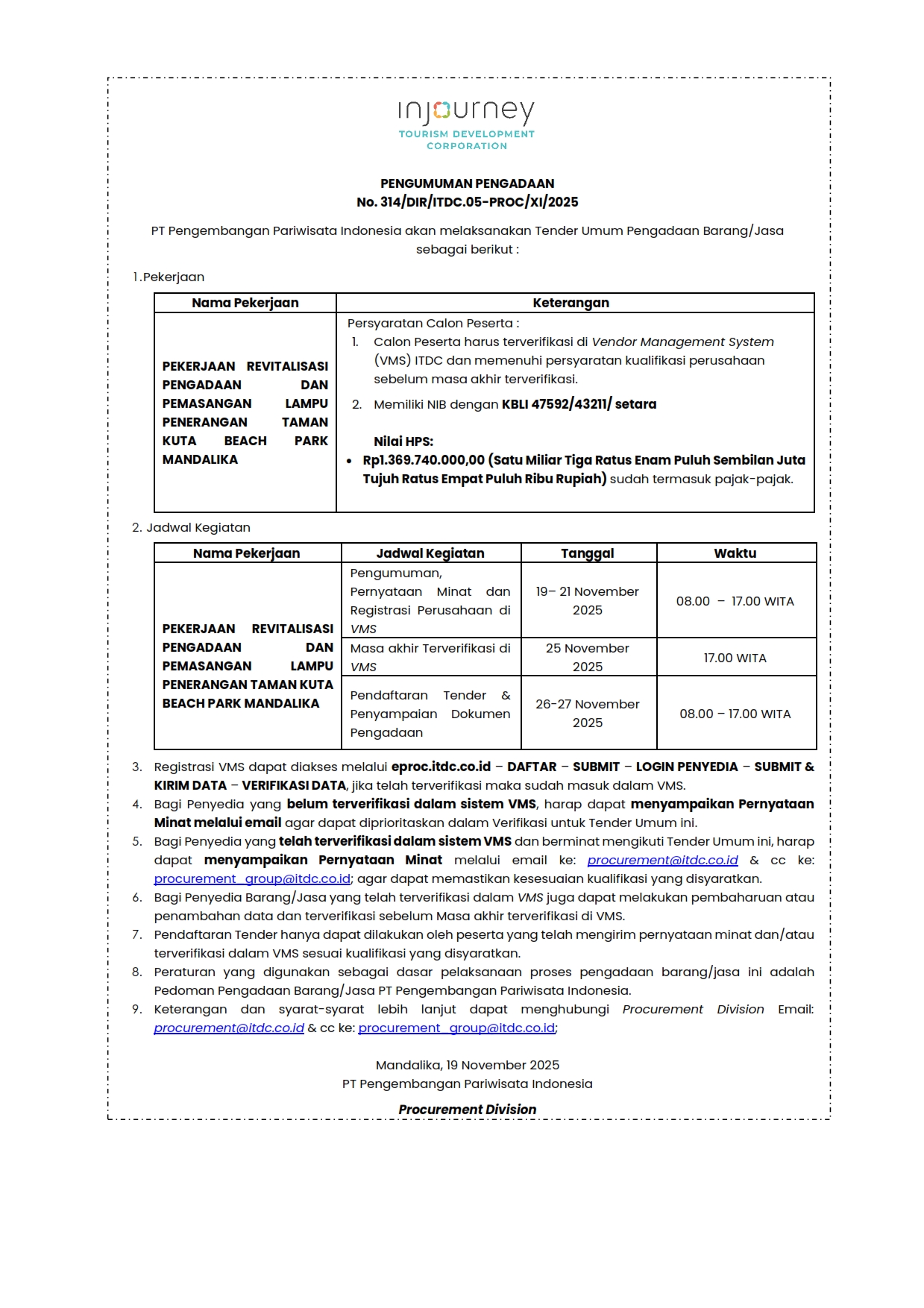 November 19, 2025 - ongoing Klik disini untuk ke halaman e-procurement