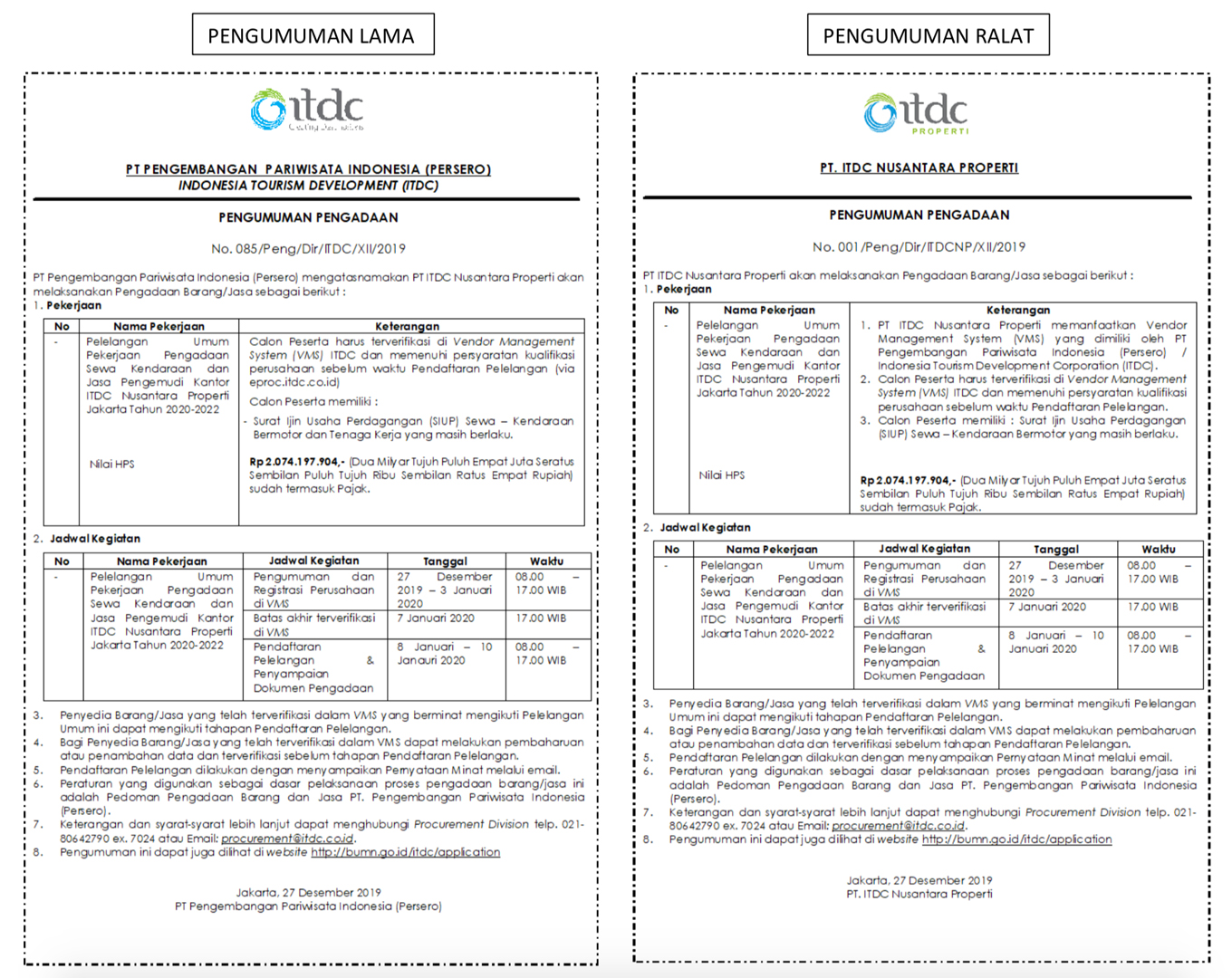 PENGUMUMAN PENGADAAN No. 001/Peng/Dir/ITDCNP/XII/2019