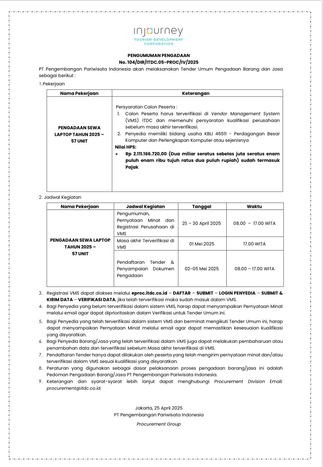 Pengumuman Pengadaan 104/DIR/ITDC.05-PROC/IV/2025