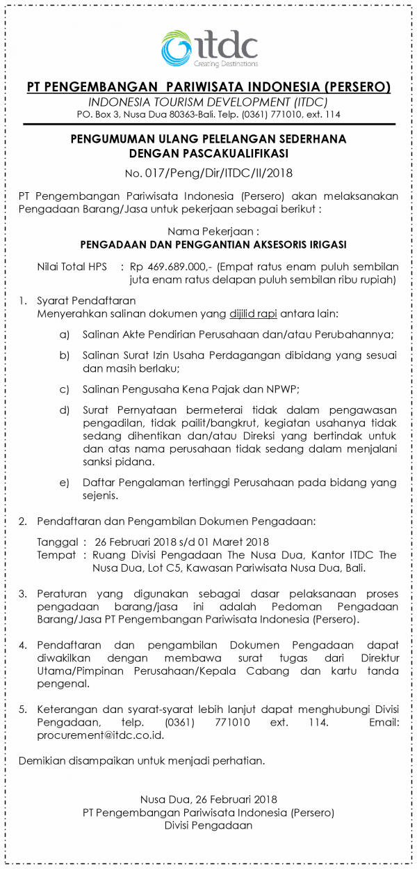 ANNOUNCEMENT OF SIMPLE TENDER AFTER POST-QUALIFICATION No. 017 / Peng / Dir / ITDC / II / 2018
