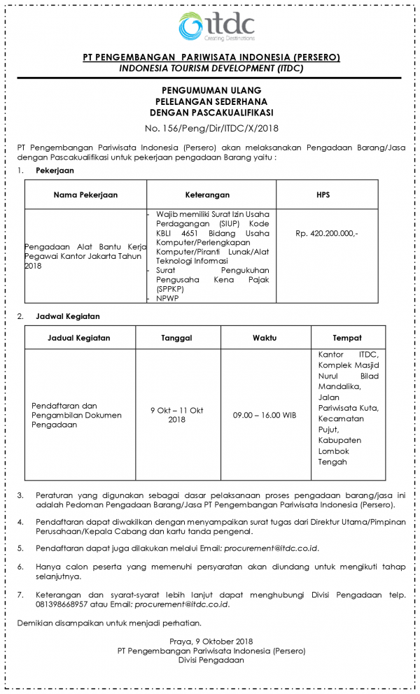 ANNOUNCEMENT OF SIMPLE TENDER AFTER POST-QUALIFICATION No. 156 / Peng / Dir / ITDC / X / 2018