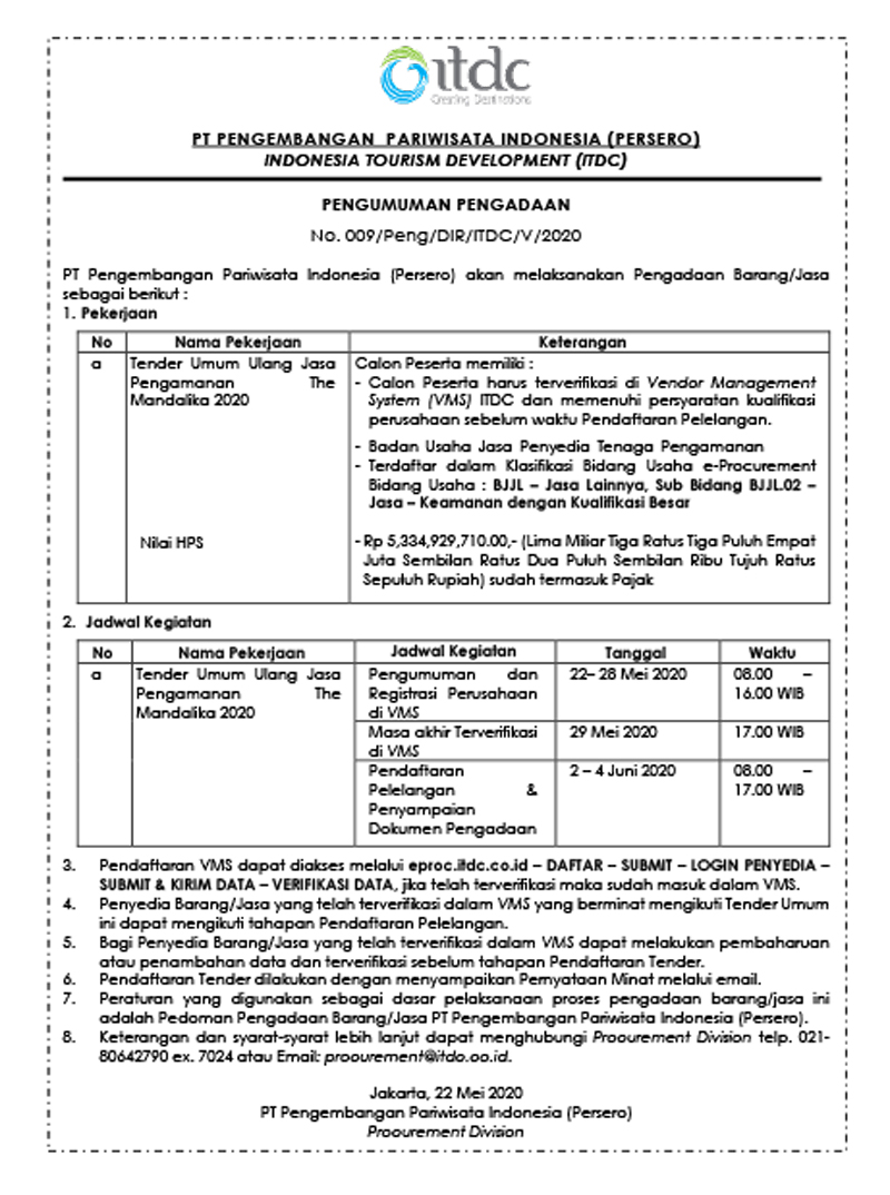 PENGUMUMAN PENGADAAN No. 009/Peng/DIR/ITDC/V/2020