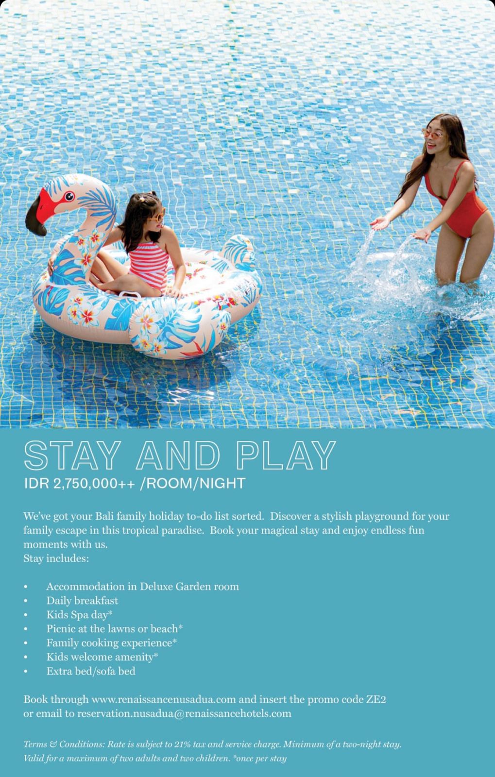 IDR 2,750,000++ /ROOM/NIGHTWe've got your Bali family holiday to-do list sorted. Discover a stylish playground for your family escape in this tropical paradise. Book your magical stay and enjoy endless fun moments with us.Stay includes:Accommodation in Deluxe Garden roomDaily breakfastKids Spa day*Picnie at the lawns or beach* Family cooking experience*Kids welcome amenity*Extra bed/sofa bedBook through