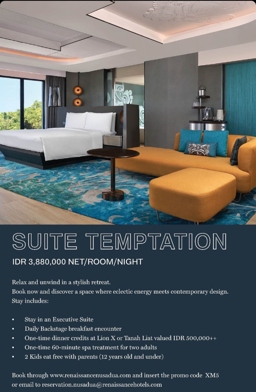 IDR 3,880,000 NET/ROOM/NIGHTRelax and unwind in a stylish retreat.Book now and discover a space where eclectic energy meets contemporary design.Stay includes:• Stay in an Executive Suite• Daily Backstage breakfast encounter• One-time dinner credits at Lion X or Tanah Liat valued IDR 500,000++• One-time 60-minute spa treatment for two adults• 2 Kids eat free with parents (12 years old and under)