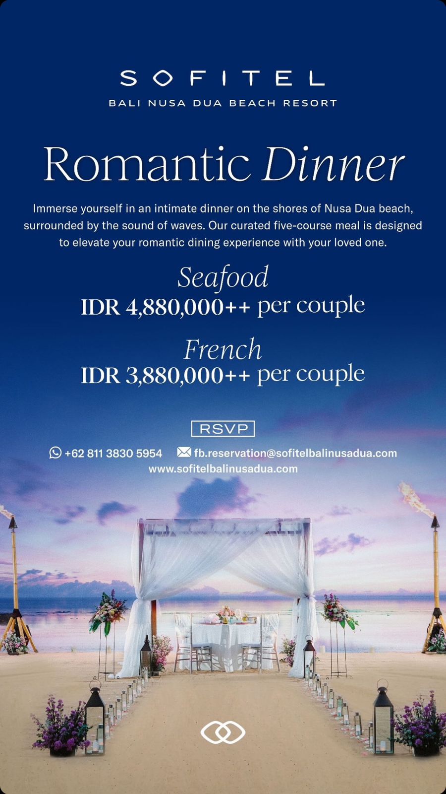 Immerse yourself in an intimate dinner on the shores of Nusa Dua beach, surrounded by the sound of waves.our curated five-course meal is designed to elevate your romentic dining exsperience with your loved one.SEAFOOD IDR 4,880,000++ per couple FRENCHIDR 3,880,000++ per couple