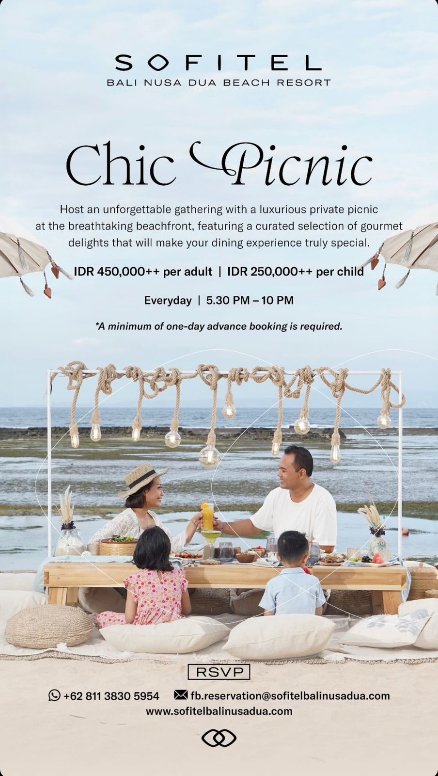 Host an unforgettable gathering with a luxurious private picnic at the breathtaking beachfront, featuring a curated selection of gourmet delights that will make your dining experience truly special.IDR 450,000++ per adult | IDR 250,000++ per childEveryday | 5.30 PM - 10 PM*A minimum of one-day advance booking is required.