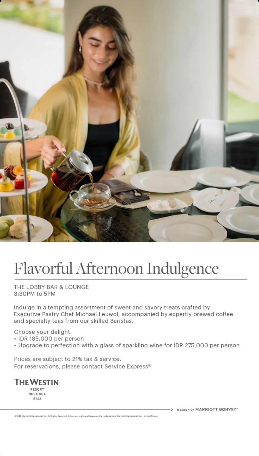THE LOBBY BAR & LOUNGE 3:30 PM TO 5PMIndulge in a tempting assortment of sweet and savor treats crafted by Executive Pastry Chep Michael Leuwol,accompanied by expertly brewed coffee and specialty teas from our skilled BaristasChoose your delight:IDR 185.000 per personUpgrade to Perfection with a glass of sprakling wine for IDR 275.000 per personprices are subject to 21% tax & service.For reservation,please contact Service Express