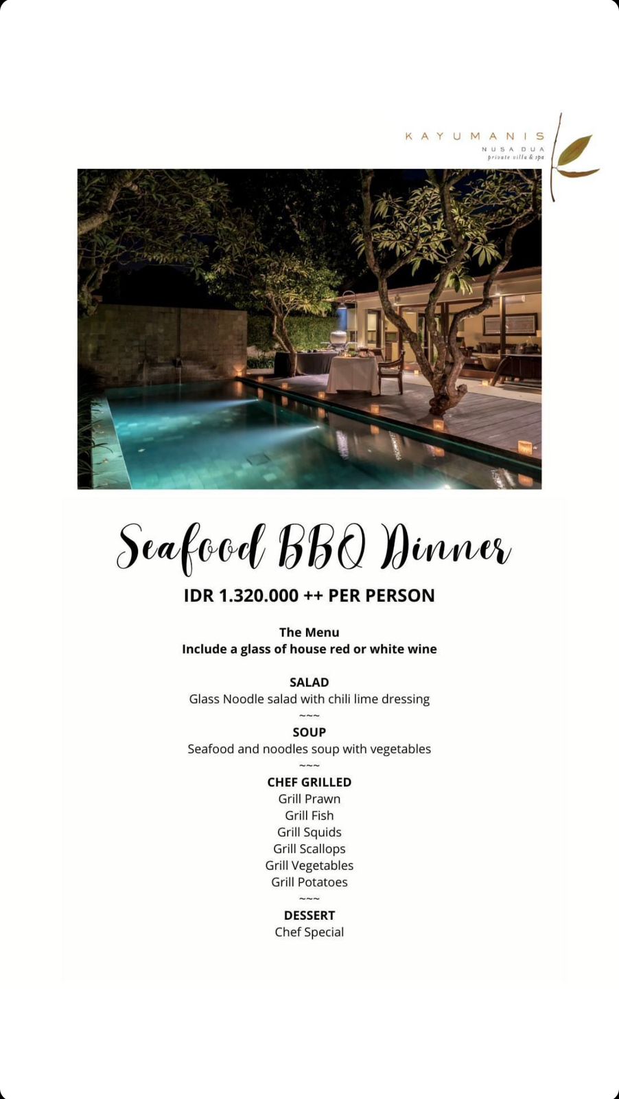 IDR 1.320.000 ++ PER PERSONThe MenuInclude a glass of house red or white wineSALADGlass Noodle salad with chili lime dressingSOUPSeafood and noodles soup with vegetablesCHEF GRILLEDGrill PrawnGrill FishGrill SquidsGrill ScallopsGrill VegetablesGrill PotatoesDESSERTChef Special