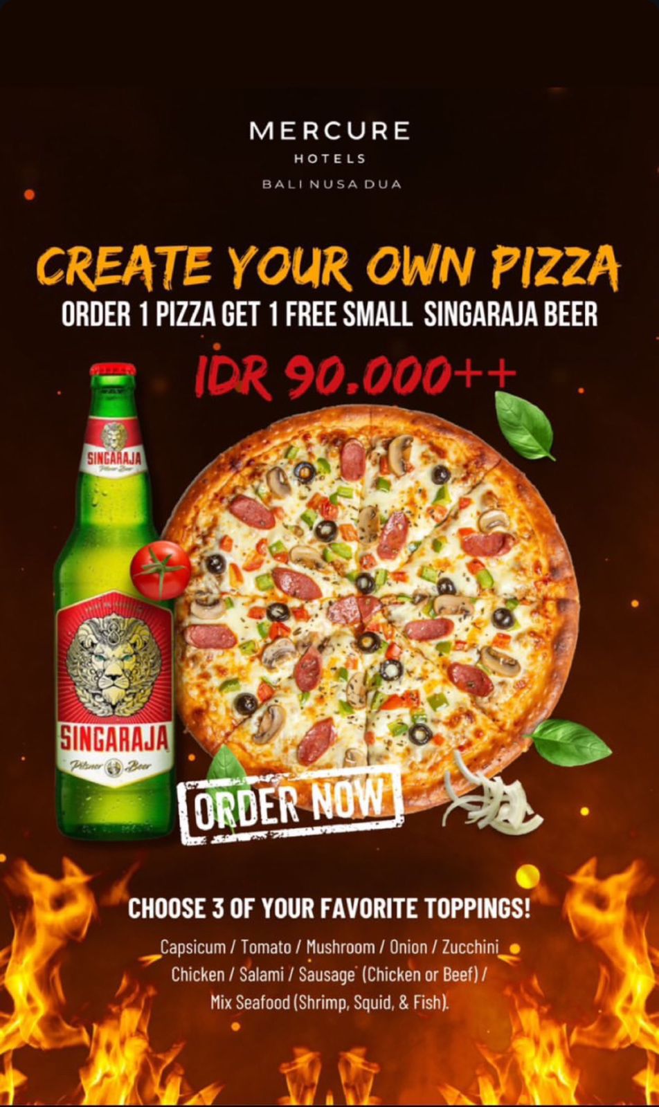 ORDER 1 PIZZA GET 1 FREE SMALL SINGARAJA BEERIDR 90.000++CHOOSE 3 OF YOUR FAVORITE TOPPINGS!Capsicum / Tomato / Mushroom / Onion / ZucchiniChicken / Salami / Sausage (Chicken or Beef) /Mix Seafood (Shrimp, Squid, & Fish).