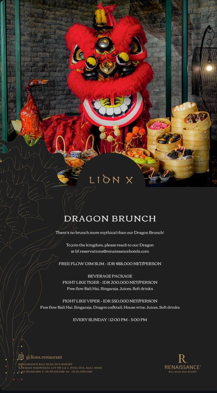 DRAGON BRUNCHThere's no brunch more mythical than our Dragon Brunch!To join the kingdom, please reach to our Dragon FREE FLOW DIM SUM - IDR 488,000 NET/PERSONBEVERAGE PACKAGEFIGHT LIKE TIGER - IDR 200.000 NET/PERSONFree flow Bali Hai. Singaraja, Juices. Soft drinksFIGHT LIKE VIPER - IDR 550,000 NET/PERSONFree flow Bali Hai. Singaraja. Dragon cocktail. House wine. Juices. Soft drinksEVERY SUNDAY 112:00 PM - 3:00 PM