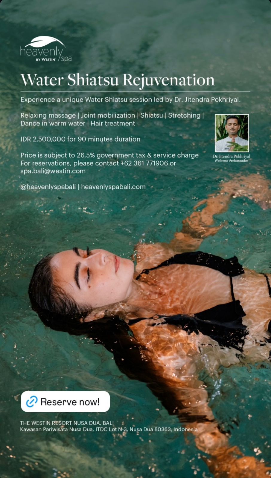 Experience a unique Water Shiatsu session led by Dr. Jitendra Pokhriyal.Relaxing massage | Joint mobilization | Shiatsu | Stretching |Dance in warm water | Hair treatmentIDR 2,500,000 for 90 minutes durationPrice is subject to 26,5% government tax & service charge