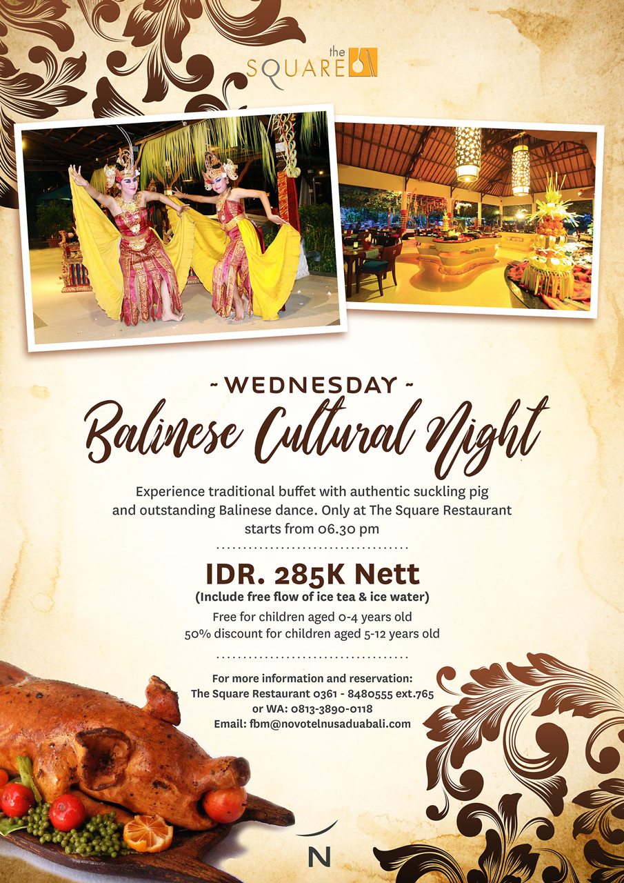 Experience traditional buffet with authentic suckling pig and outstanding Balinese dance. Only at The Square Restaurant starts from 06.30 pmIDR. 285K Nett (Include free flow of ice tea & ice water)Free for children aged 0-4 years old 50% discount for children aged 5-12 years oldFor more information and reservation: The Square Restaurant 0361 - 8480555 ext.765 or WA: 0813-3890-0118Email: fbm@novotelnusaduabali.com