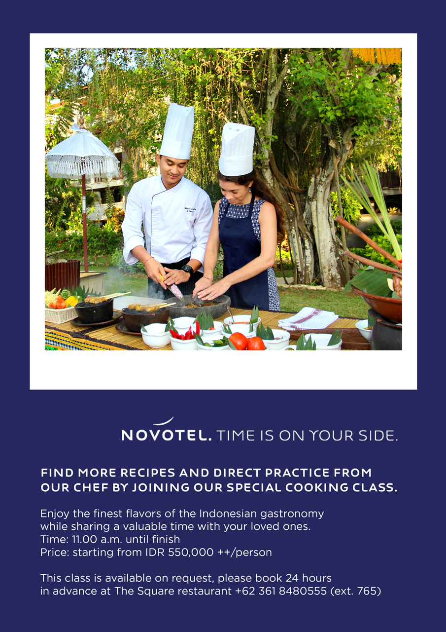 Find more recipes and direct practice from our Chef by joining our special Cooking Class. Enjoy the finest flavors of the Indonesian gastronomywhile sharing a valuable time with your loved ones.Time: 11.00 a.m. until finishPrice: starting from IDR 550,000 ++/personThis class is available on request, please book 24 hoursin advance at The Square restaurant +62 361 8480555 (ext. 765)