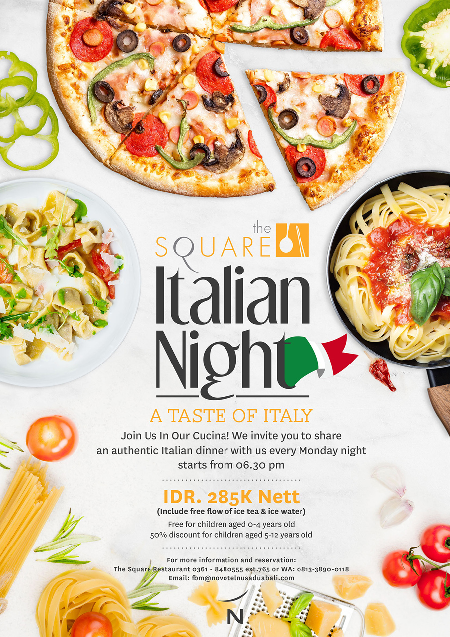 A TASTE OF ITALYJoin Us In Our Cucina! We invite you to share an authentic Italian dinner with us every Monday night starts from 06.30 pmIDR. 285K Nett (Include free flow of ice tea & ice water) Free for children aged 0-4 years old 50% discount for children aged 5-12 years oldFor more information and reservation:The Square Restaurant 0361 - 8480555 ext.765 or WA: 0813-3890-0118Email: fbm@novotelnusaduabali.com