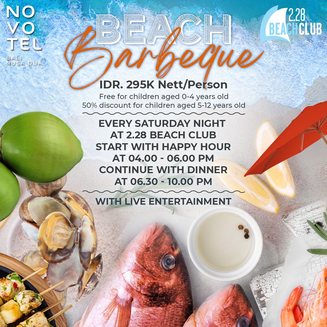 IDR. 295K Nett/PersonFree for children aged 0-4 years old50% discount for children aged 5-12 years old Every SATURDAY night at 2.28 BEACH CLUBstart with happy hour at 04.00 - 06.00 pmcontinue with dinner at 06.30 - 10.00 pmwith LIVE Entertainment For more information and reservation, please contact:The Square Restaurant 0361 - 8480555 ext.765 or WA: 0813-3890-0118Email: fbm@novotelnusaduabali.com