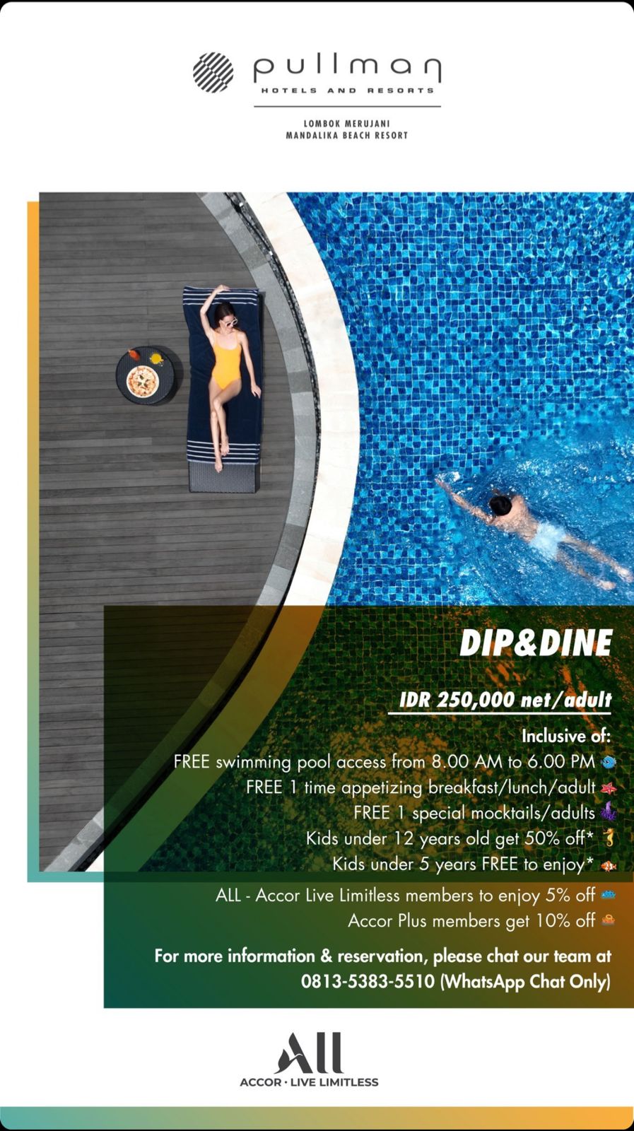 IDR 250.000 net/adult FREE swiming pool access from 8.00 AM to 6.00 PM FREE 1 Time appetizing breakfast/lunch/adultFREE 1 special mocktails/adultKids under 12 years old get 50% offKids under 5 years FREE to enjoyAll-accor Live Limitless member to enjoy 5% offAccor Plus member get 10% off