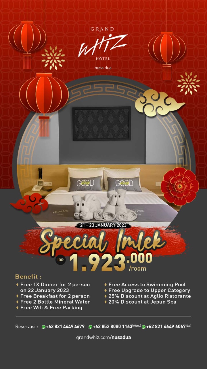 Special Imlek IDR 1.923.000/room21-23 JANUARY 2023Benefit :- Free 1X Dinner for 2 person on 22 January 2023- Free Breakfast for 2 person- Free 2 Bottle Mineral Water- Free Wifi & Free Parking- Free Access to Swimming Pool- Free Upgrade to Upper Category- 25% Discount at Aglio Ristorante- 20% Discount at Jepun SpaReservasi : +62 821 4449 4679 | +62 852 8080 1163 (Wisnu) | +62 821 4649 6067 (Eval)grandwhiz.com/nusadua