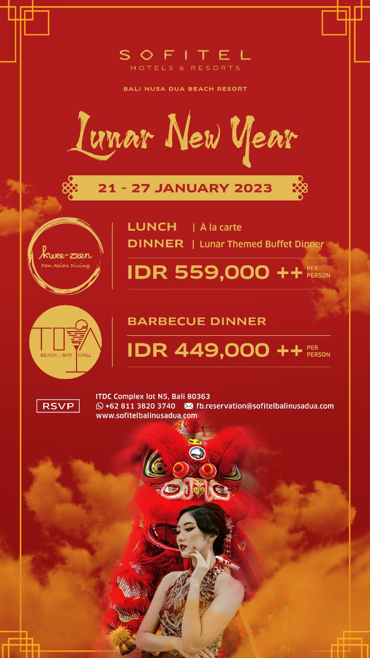 Lunar New Year 21-27 JANUARY 2023LUNCH | À la carteDINNER | Lunar Themed Buffet DinnerIDR 559,000 ++ PER PERSONBARBECUE DINNERIDR 449,000 ++ PER PERSONReservation:ITDC Complex lot N5, Bali 80363fb.reservation@sofitelbalinusadua.com+62 811 3820 3740www.sofitelbalinusadua.com