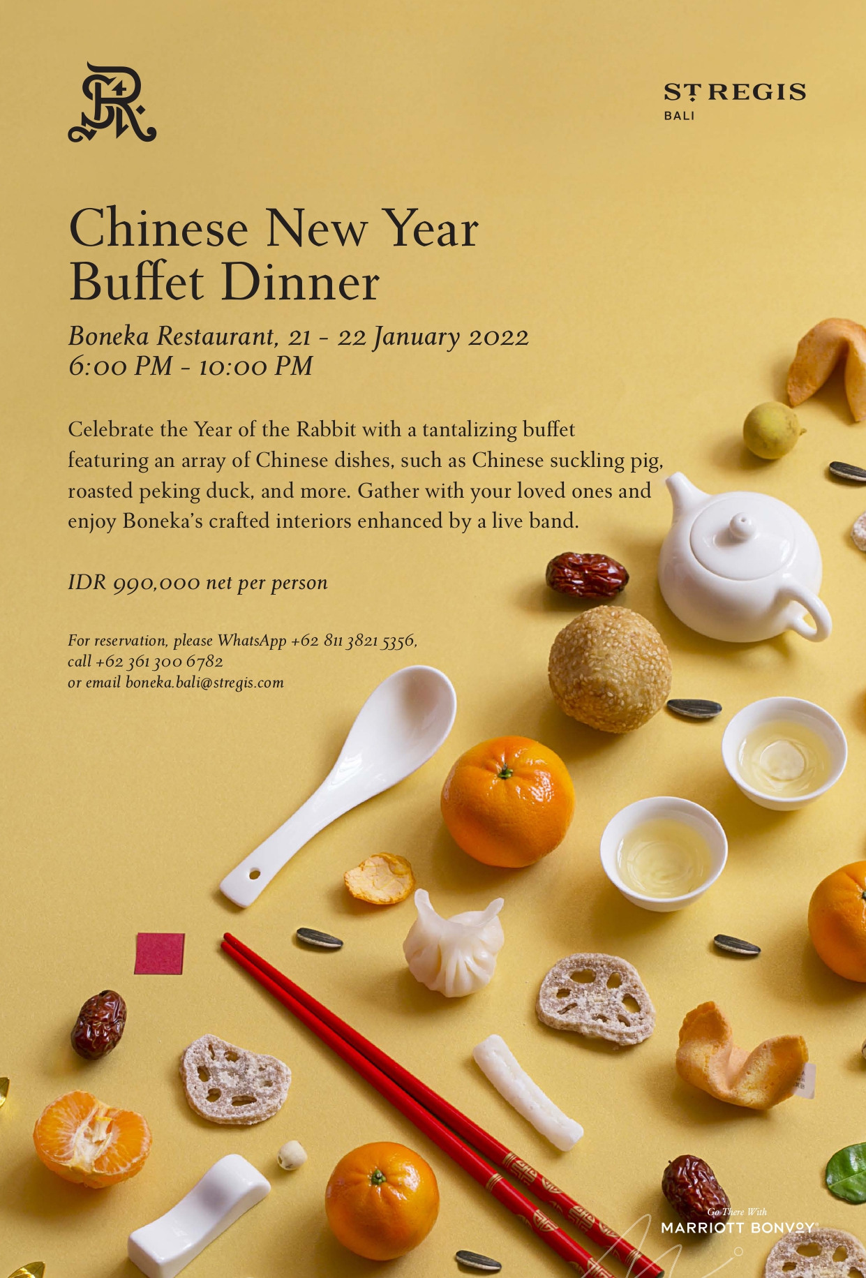 Boneka Restaurant, 21 - 22 January 2022 6:00 PM - 10:00 PMCelebrate the Year of the Rabbit with a tantalizing buffet featuring an array of Chinese dishes, such as Chinese suckling pig, roasted peking duck, and more. Gather with your loved ones and enjoy Boneka's crafted interiors enhanced by a live band.IDR 990,000 net per personFor reservation, please WhatsApp +62 811 3821 5356, call +62 361 300 6782 or email boneka.bali@stregis.com