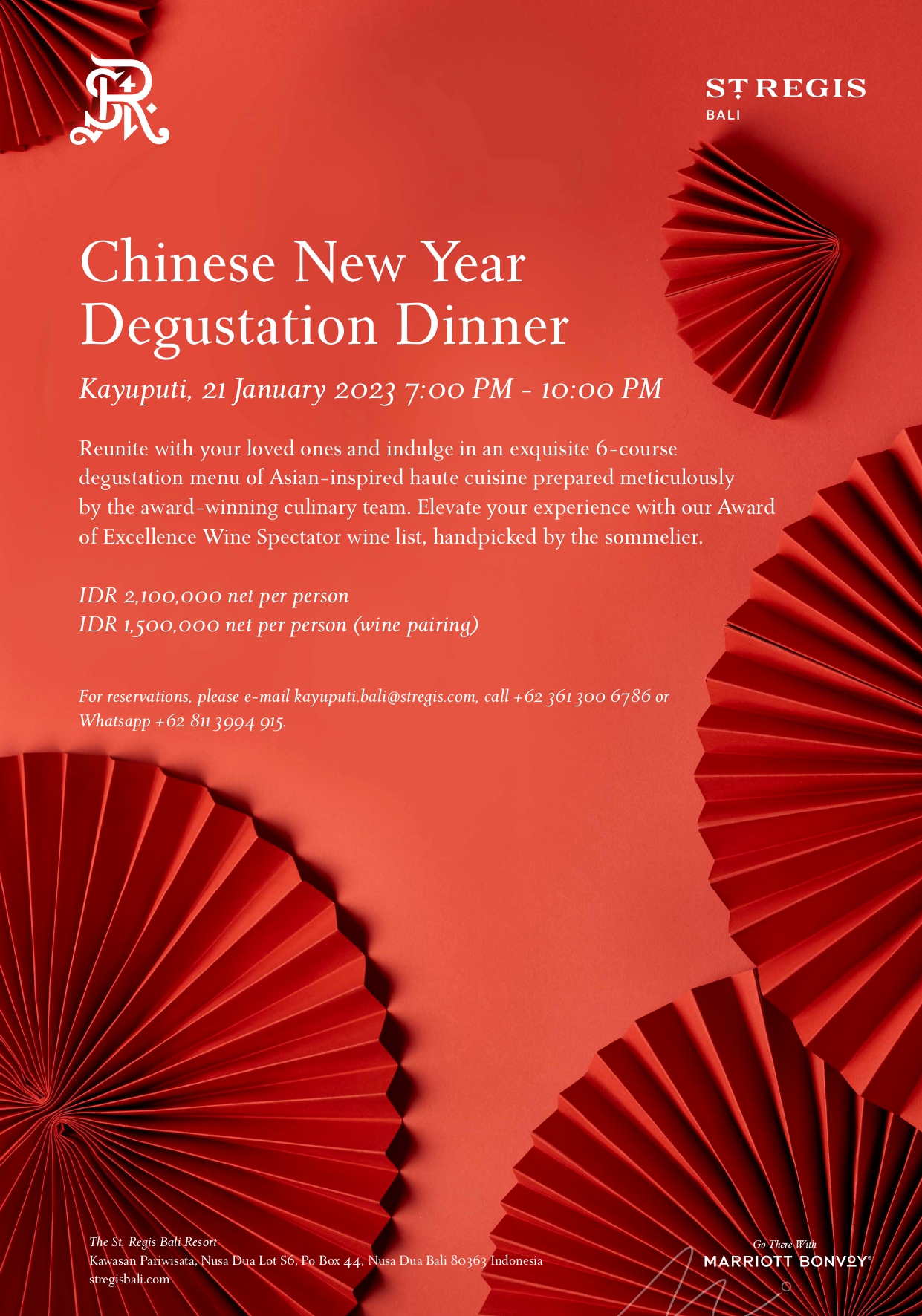 Kayuputi, 21 January 2023 7:00 PM - 10:00 PMReunite with your loved ones and indulge in an exquisite 6-course degustation menu of Asian-inspired haute cuisine prepared meticulously by the award-winning culinary team. Elevate your experience with our Award of Excellence Wine Spectator wine list, handpicked by the sommelier.IDR 2,100,000 net per personIDR 1,500,000 net per person (wine pairing)For reservations, please e-mail kayuputi.bali@stregis.com, call +62 361 300 6786 or Whatsapp +62 811 3994 915.The St. Regis Bali ResortKawasan Pariwisata, Nusa Dua Lot S6, Po Box 44, Nusa Dua Bali 80363 Indonesiastregisbali.com