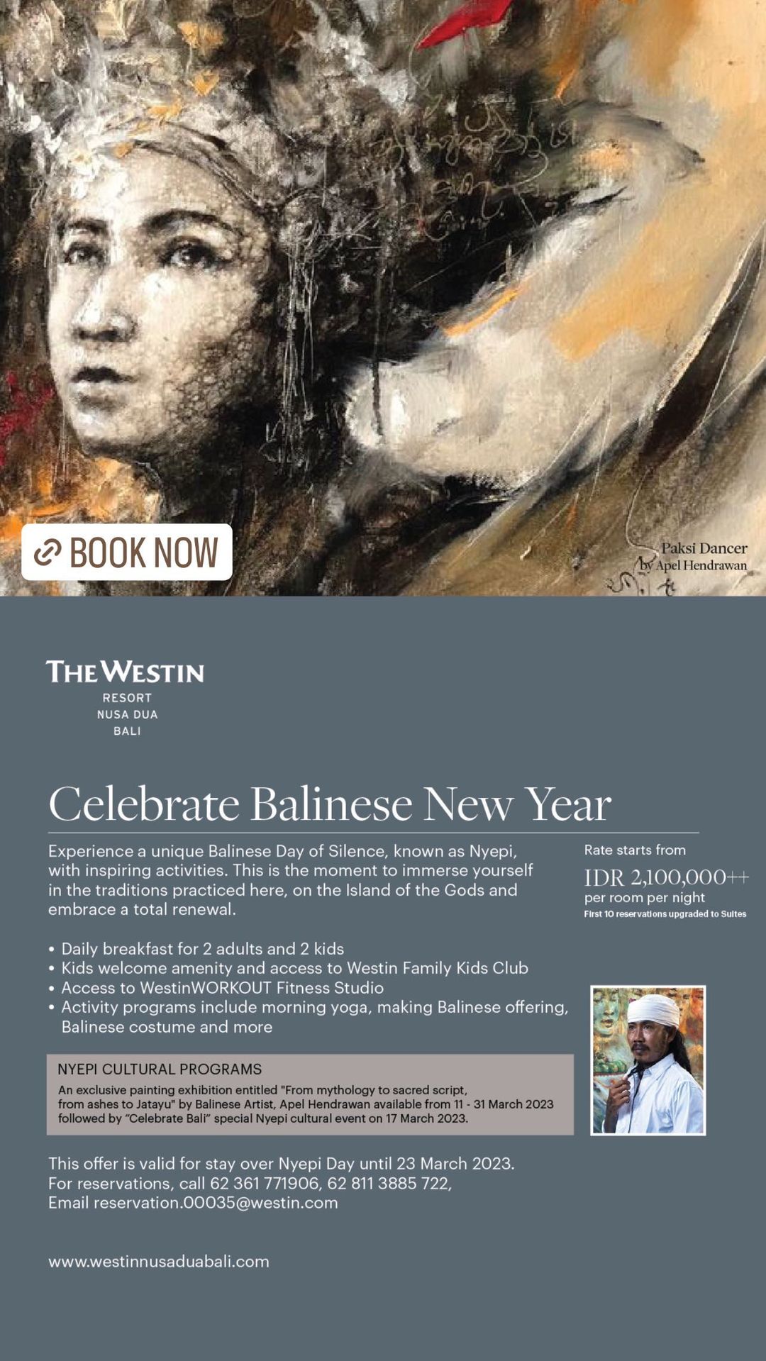 THE WESTIN RESORT NUSA DUA BALICelebrate Balinese New YearExperience a unique Balinese Day of Silence, known as Nyepi, with inspiring activities. This is the moment to immerse yourself in the traditions practiced here, on the Island of the Gods and embrace a total renewal.- Daily breakfast for 2 adults and 2 kids- Kids welcome amenity and access to Westin Family Kids Club- Access to Westin WORKOUT Fitness Studio- Activity programs include morning yoga, making Balinese offering, Balinese costume and moreNYEPI CULTURAL PROGRAMSAn exclusive painting exhibition entitled "From mythology to sacred script, from ashes to Jatayu" by Balinese Artist, Apel Hendrawan available from 11 - 31 March 2023 followed by "Celebrate Bali" special Nyepi cultural event on 17 March 2023.This offer is valid for stay over Nyepi Day until 23 March 2023. For reservations, call 62 361 771906, 62 811 3885 722, Email reservation.00035@westin.comRate starts from IDR 2,100,000++ per room per nightFirst 10 reservations upgraded to Suiteswww.westinnusaduabali.com