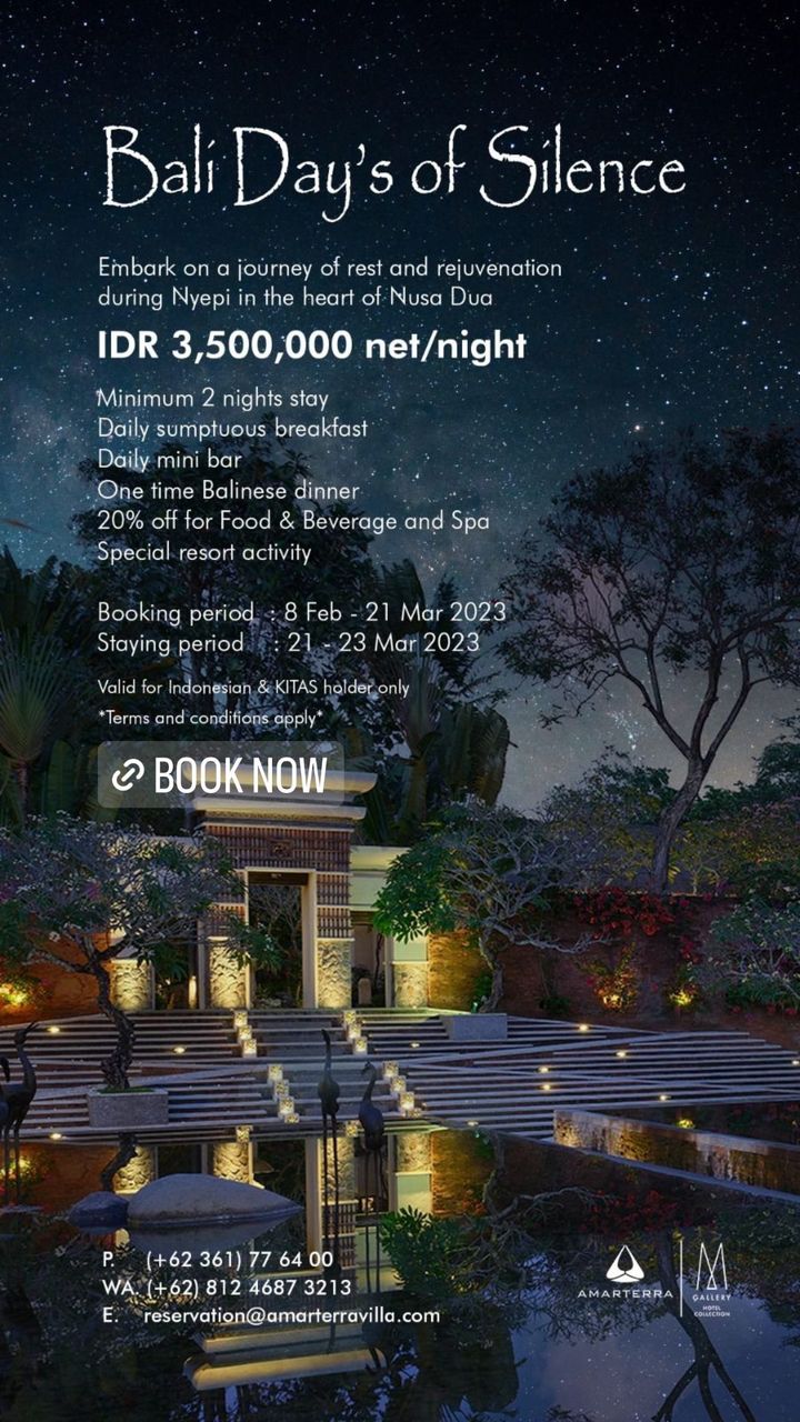 Bali Day's of SilenceEmbark on a journey of rest and rejuvenation during Nyepi in the heart of Nusa DuaIDR 3,500,000 net/nightMinimum 2 nights stayDaily sumptuous breakfast Daily mini barOne time Balinese dinner20% off for Food & Beverage and SpaSpecial resort activityBooking period 8 Feb - 21 Mar 2023Staying period 21 23 Mar 2023Valid for Indonesian & KITAS holder only*Terms and conditions apply*BOOK NOWP. (+62 361) 77 64 00 WA (+62) 812 4687 3213 E. reservation@amarterravilla.com