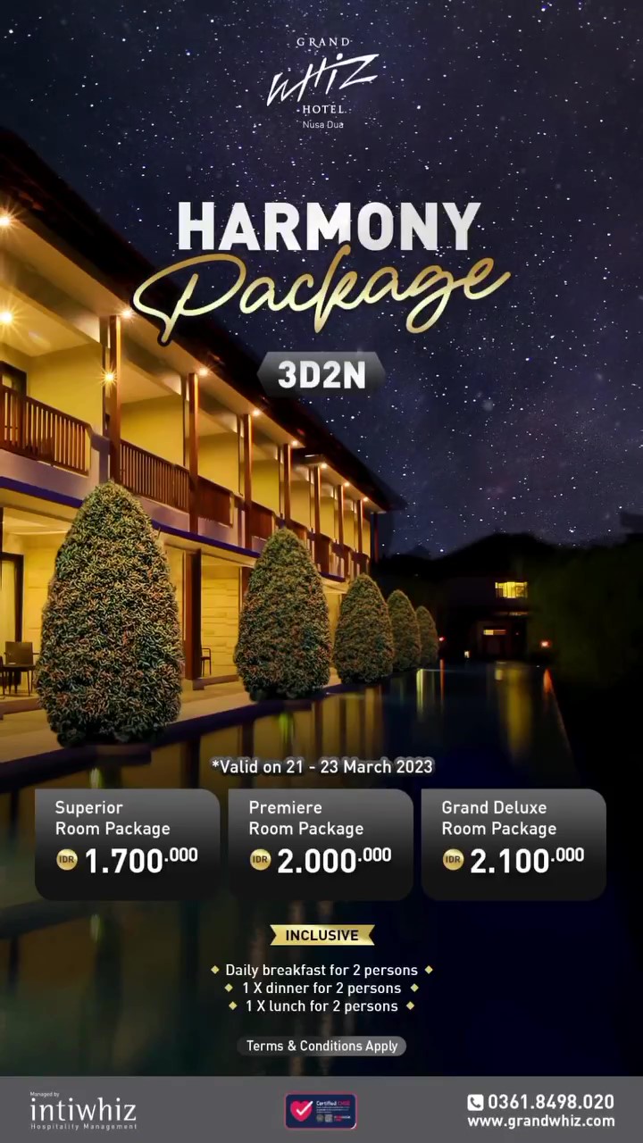 Nusa Dua Harmony Package 3D2NSuperior Room Package IDR 1.700.000Premiere Room Package IDR 2.000.000Grand Deluxe Room Package IDR 2.100.000INCLUSIVE- Daily breakfast for 2 persons- 1 X dinner for 2 persons 1 X lunch for 2 persons- Terms & Conditions Apply- Valid on 21-23 March 20230361.8498.020 www.grandwhiz.com