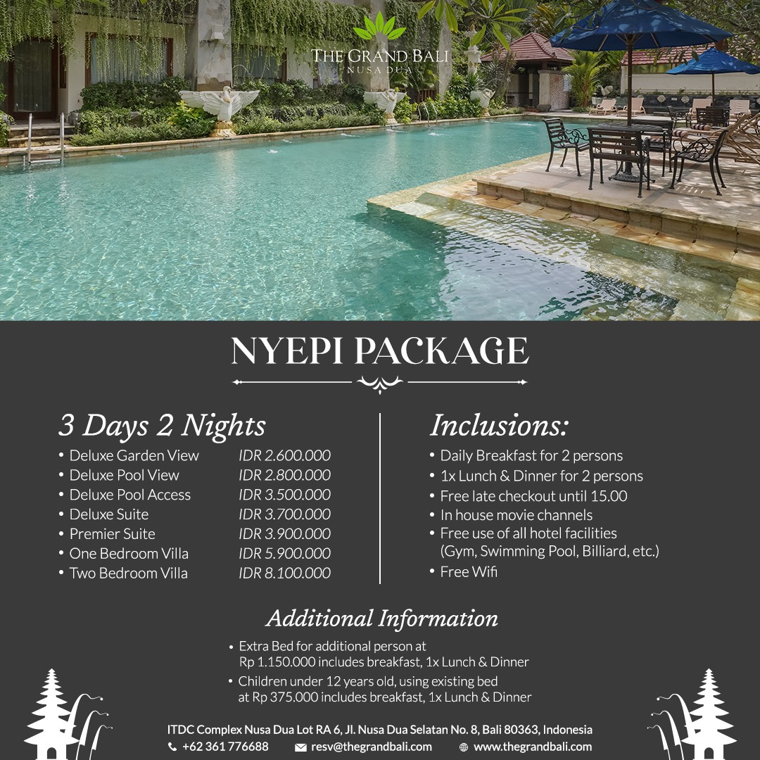 THE GRAND BALI NUSA DUANYEPI PACKAGE 3 Days 2 Nights• Deluxe Garden View IDR 2.600.000• Deluxe Pool View IDR 2.800.000• Deluxe Pool Access IDR 3.500.000• Deluxe Suite IDR 3.700.000• Premier Suite IDR 3.900.000• One Bedroom Villa IDR 5.900.000• Two Bedroom Villa IDR 8.100.000Inclusions:• Daily Breakfast for 2 persons• 1x Lunch & Dinner for 2 persons• Free late checkout until 15.00• In house movie channels• Free use of all hotel facilities (Gym, Swimming Pool, Billiard, etc.)• Free WifiAdditional Information• Extra Bed for additional person at Rp1.150.000 includes breakfast, 1x Lunch & Dinner• Children under 12 years old, using existing bed at Rp375.000 includes breakfast, 1x Lunch & DinnerITDC Complex Nusa Dua Lot RA 6, JI. Nusa Dua Selatan No. 8, Bali 80363, Indonesia+62 361 776688resv@thegrandbali.comwww.thegrandbali.com