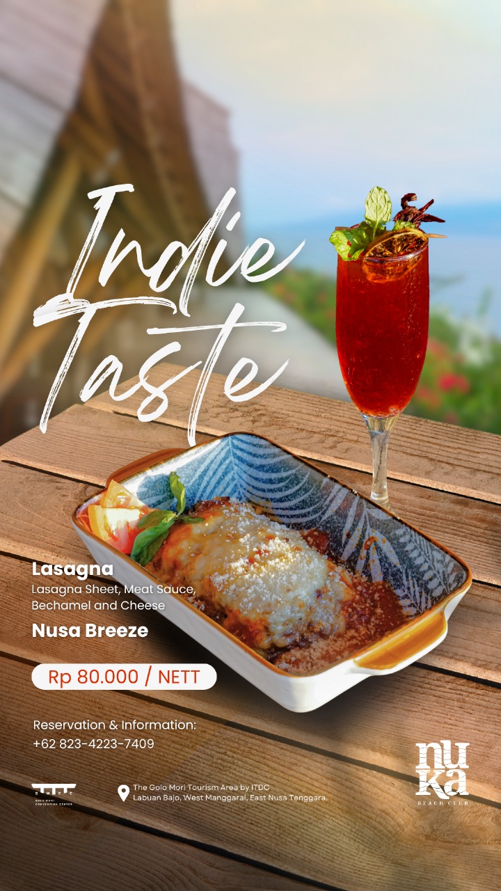 Indie Taste LasagnaLasagna Sheet, Meat Sauce, Bechamel and Cheese Nusa BreezeRp 80.000 / NETT Reservation & Information:+62 823-4223-7409 The Golo Mori Tourism Area by ITDCLabuan Bajo, West Manggarai, East Nusa Tenggara.NUKA BEACH CLUB.