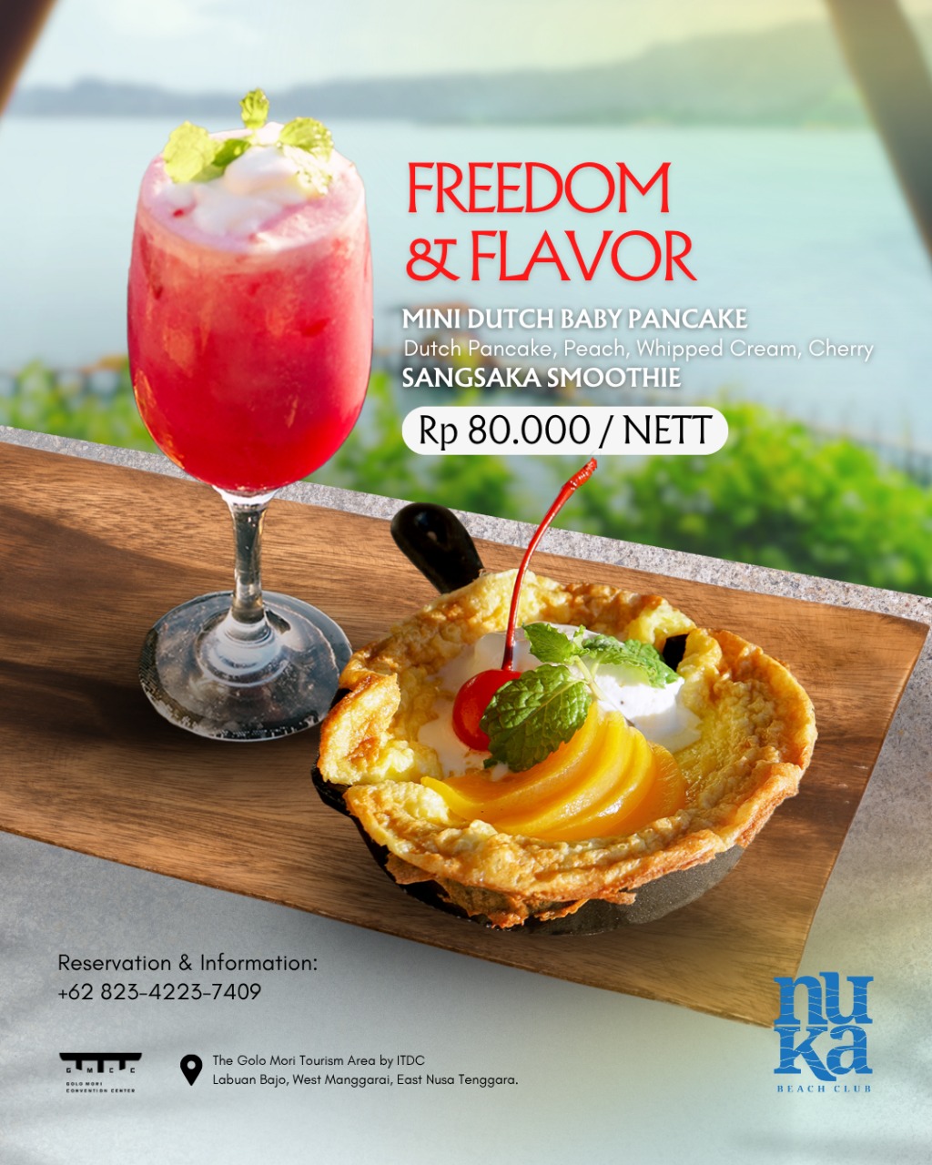 FREEDOM & FLAVORMINI DUTCH BABY PANCAKE.Dutch Pancake, Peach, Whipped Cream, CherrySANGSAKA SMOOTHIE Rp 80.000 / NETT Reservation & Information: +62 823-4223-7409 The Golo Mori Tourism Area by ITDCLabuan Bajo, West Manggarai, East Nusa Tenggara.NUKA BEACH CLUB