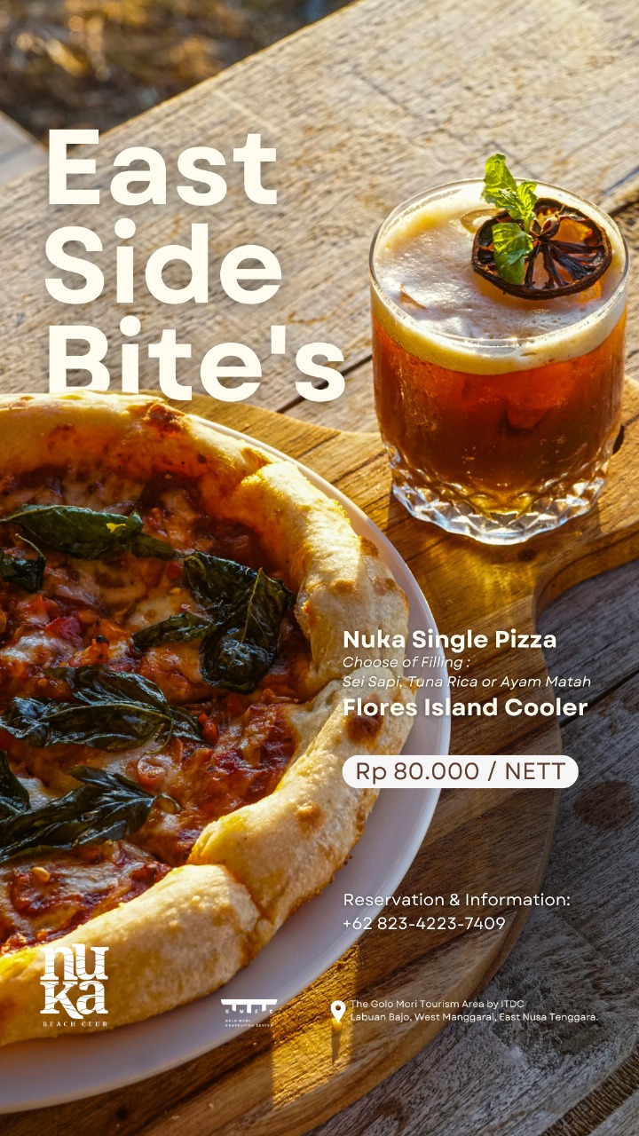 East Side Bite's Nuka Single PizzaChoose of Filling:Sei Sapi, Tuna Rica or Ayam MatahFlores Island Cooler Rp 80.000 / NETT Reservation & Information:+62 823-4223-7409 The Golo Mori Tourism Area by ITDCLabuan Bajo, West Manggarai, East Nusa Tenggara.NUKA BEACH CLUB