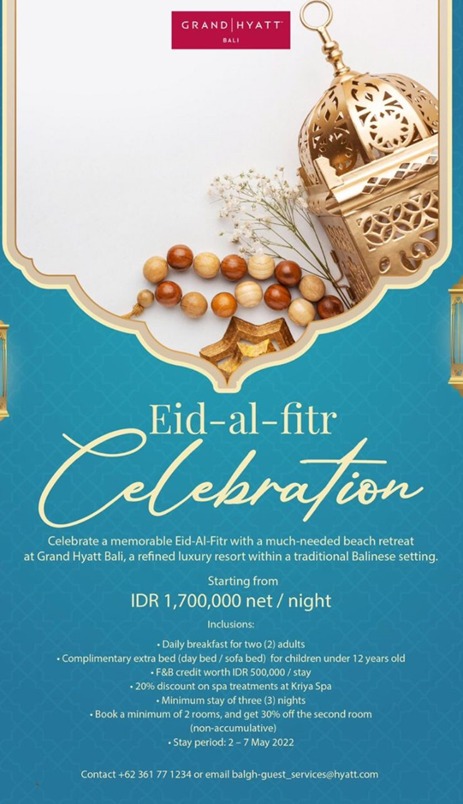 Celebrate a memorable Eid-Al-Fitr with a much-needed beach retreat at Grand Hyatt Bali, a refined luxury resort within a traditional Balinese setting.Starting from IDR 1,700,000 net / nightDaily breakfast for two (2) adultsComplimentary extra bed (day bed / sofa bed)  for children under 12 years oldF&B credit worth IDR 500,000 / stay20% discount on spa treatments at Kriya SpaMinimum stay of three (3) nightsBook a minimum of 2 rooms, and get 30% off the second room  (non-accumulative)Stay period: 2 – 7 May 2022Contact +62 361 77 1234 or email balgh-guest_services@hyatt.com