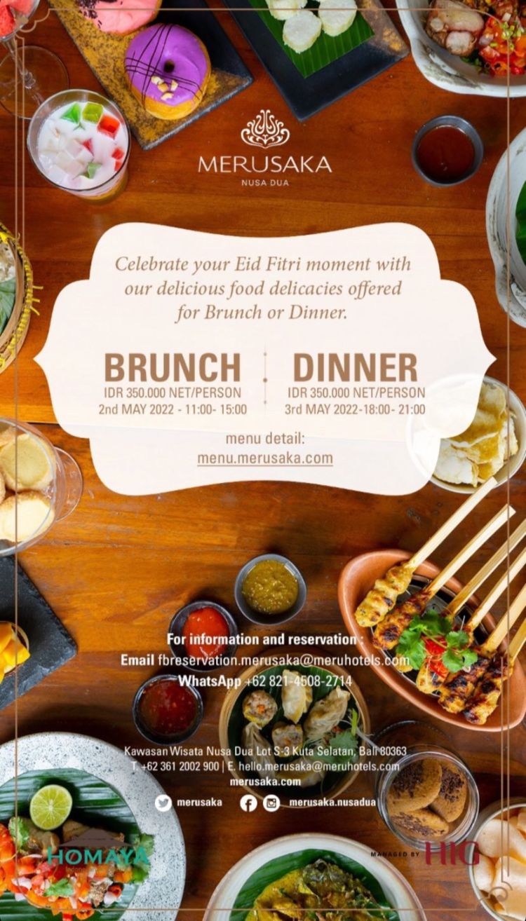 Celebrate your Eid Fitri moment with our delicious food delicacies offered for Brunch and Dinner.BRUNCHIDR 350.000 net/person2nd May 2022 | 11:00-15:00DINNERIDR 350.000 net/person3rd May 2022 | 18:00-21:00Menu detail: menu.merusaka.com