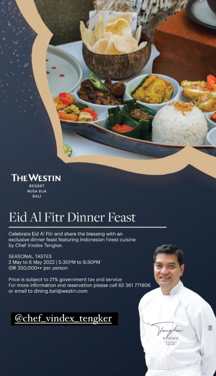 Embrace a festive Eid Mubarak celebration with family, friends, and loved ones by having culinary treats, typical of each family during Idul Fitri.Enjoy dishes of ketupat opor ayam, rendang padang, Ikan Tuturuga, sautéed pumpkin, and chili fried tempeh.Accor Plus members enjoy 20% off.Price: IDR 250,000 ++ per personOffer Validity 1 – 3 May 2022Venue Terra Terrace,Amarterra Villas Nusa Dua BaliTime 6pm – 9pmMember Benefits Accor Plus members enjoy 20% off