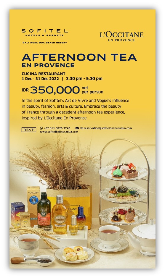 CUCINA RESTAURANT1 Dec - 31 Dec 2022 | 3.30 pm - 5.30 pmIDR 350,000 net per personIn the spirit of Sofitel's Art de Vivre and Vogue's influence in beauty, fashion, arts & culture. Embrace the beauty of France through a decadent afternoon tea experience, inspired by L'Occitane En Provence. RSVP +6281138203740www.sofitelbalinusadua.com fb.reservation@sofitelbalinusadua.com