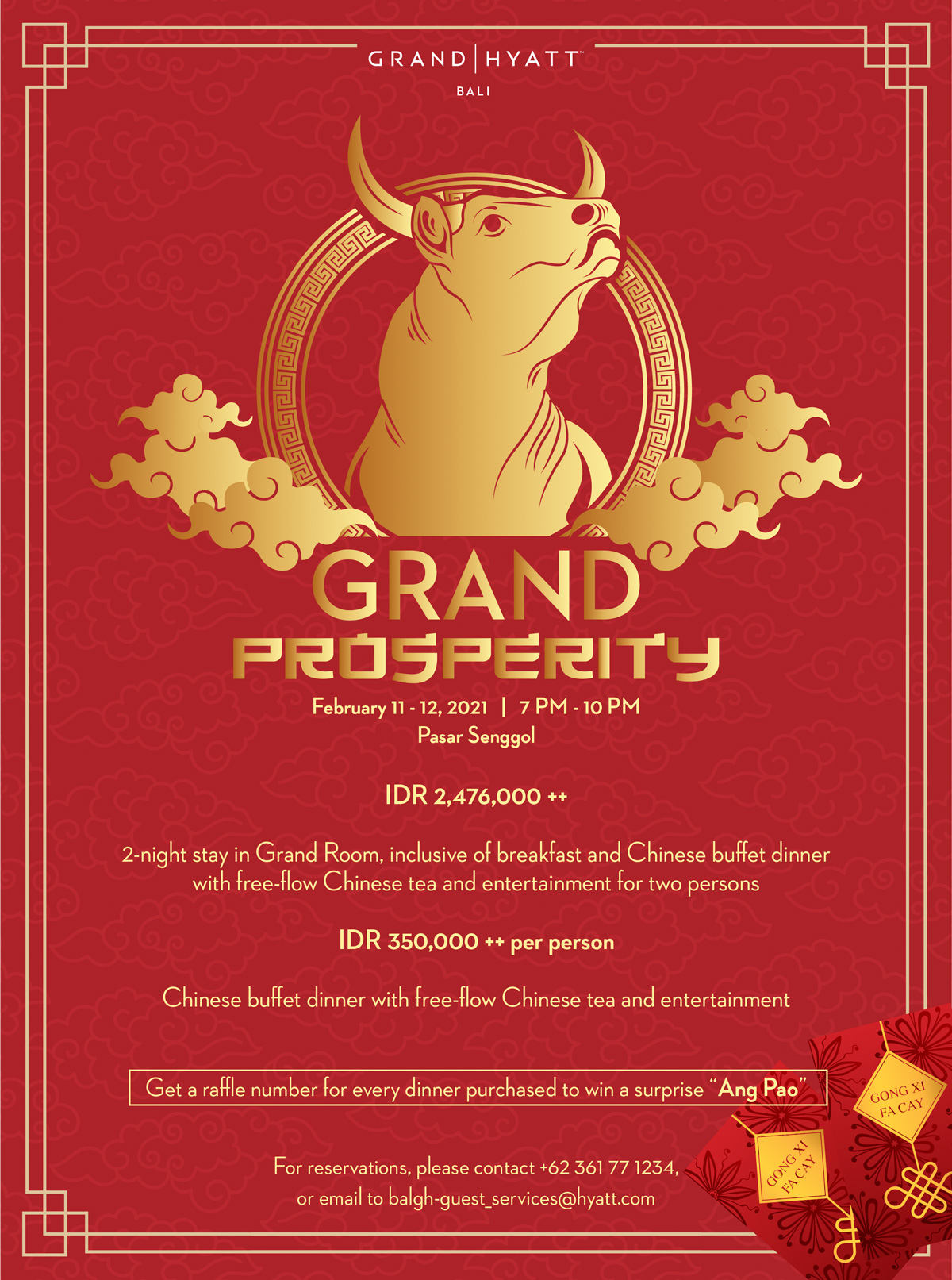 Enjoy an auspicious Chinese New Year buffet dinner at only IDR 350,000++ per person, complete with entertainment, and inclusive of free-flow Chinese tea. Make your Chinese New Year holiday even more memorable by opting for the accommodation package at IDR 2,476,000++, inclusive of two-night stay in Grand room including breakfast, as well as Chinese buffet dinner with free-flow Chinese tea for two persons.