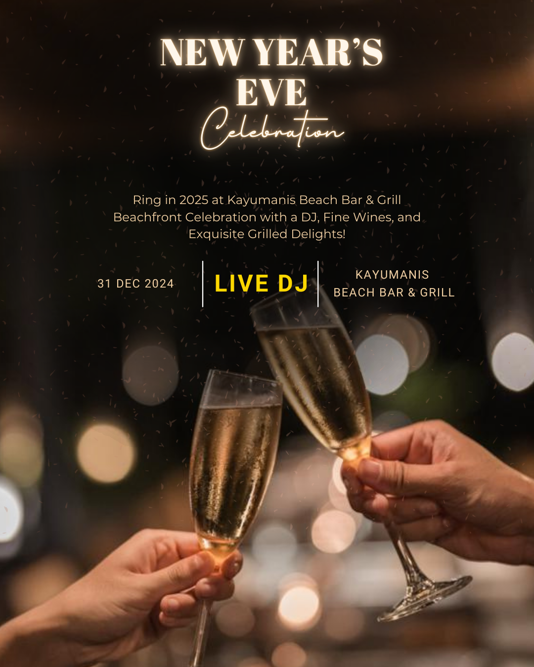 Ring in 2025 at Kayumanis Beach Bar & Grill Beachfront Celebration with a DJ, Fine Wines, and Exquisite Grilled Delights!KAYUMANIS | 31 DEC 2024 | LIVE DJ BEACH BAR & GRILL