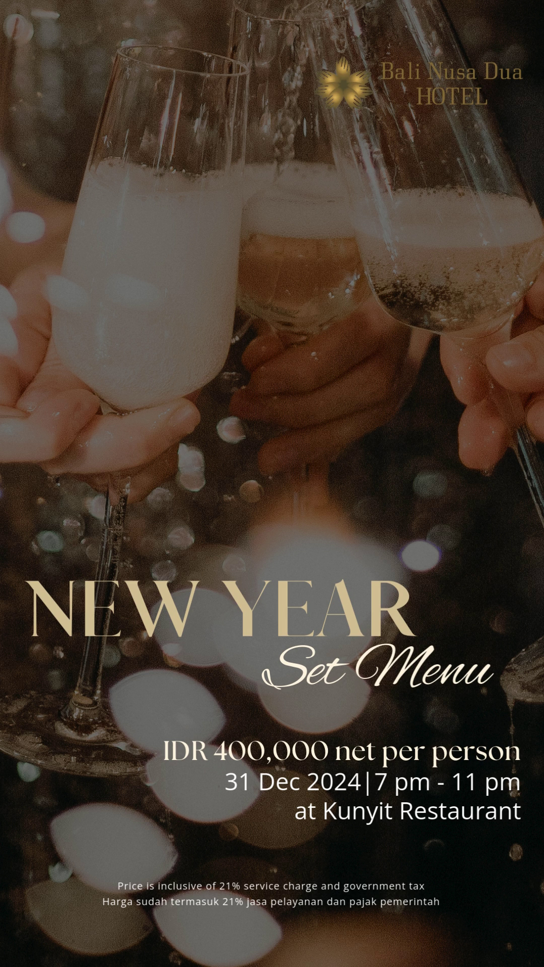 Bali Nusa Dua HotelNew Year Set MenuIDR 400,000 net per person31 Dec 2024 | 7 pm - 11 pm at Kunyit RestaurantPrice is inclusive of 21% service charge and government tax Harga sudah termasuk 21% jasa pelayanan dan pajak pemerintah