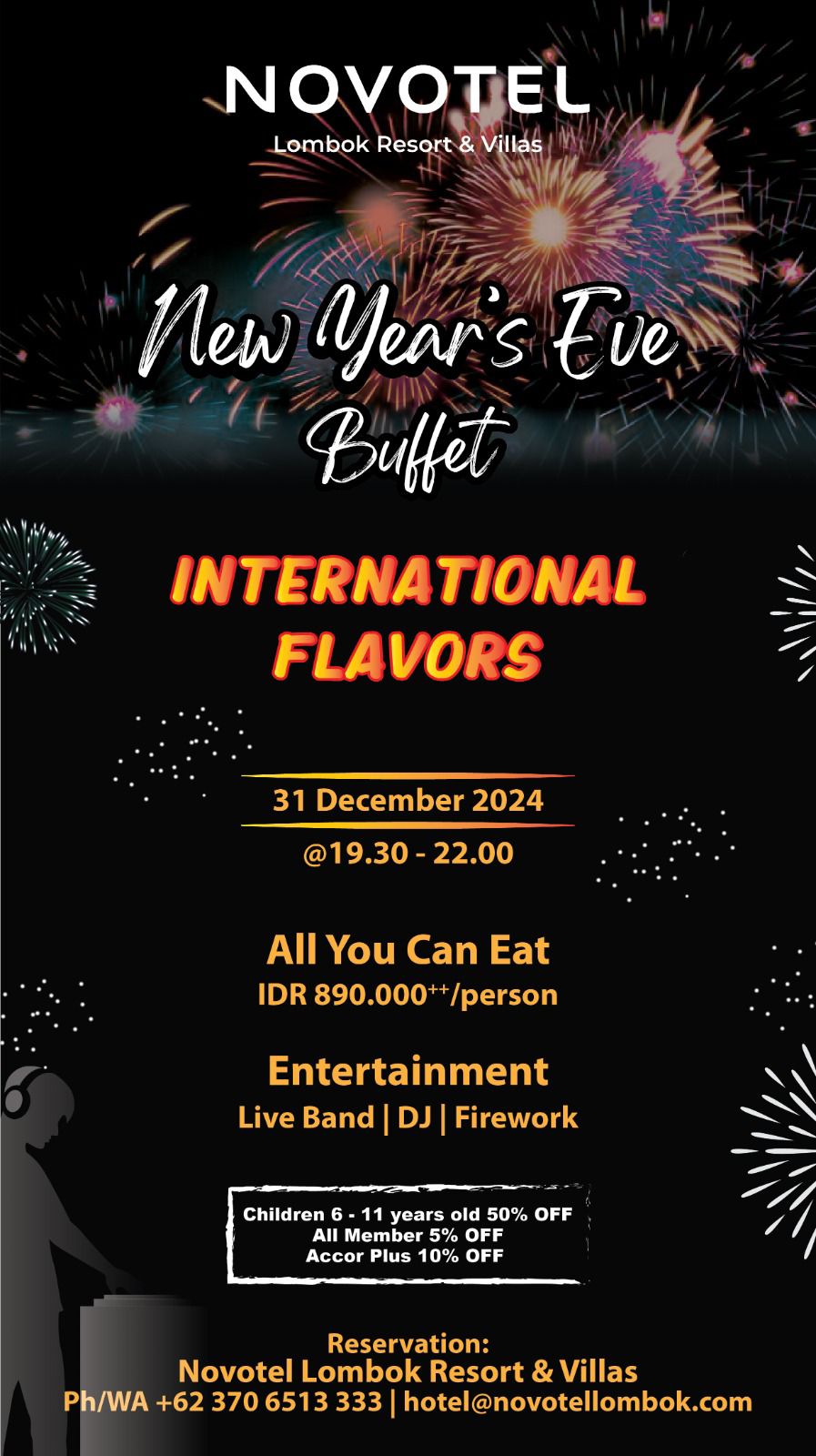 INTERNATIONAL FLAVORS31 December 2024 @19.30-22.00All You Can Eat IDR 890.000++/personEntertainment: Live Band | DJ | FireworkChildren 6-11 years old 50% OFFAll Member 5% OFFAccor Plus 10% OFFReservation:Novotel Lombok Resort & VillasPh/WA +62 370 6513 333 | hotel@novotellombok.com