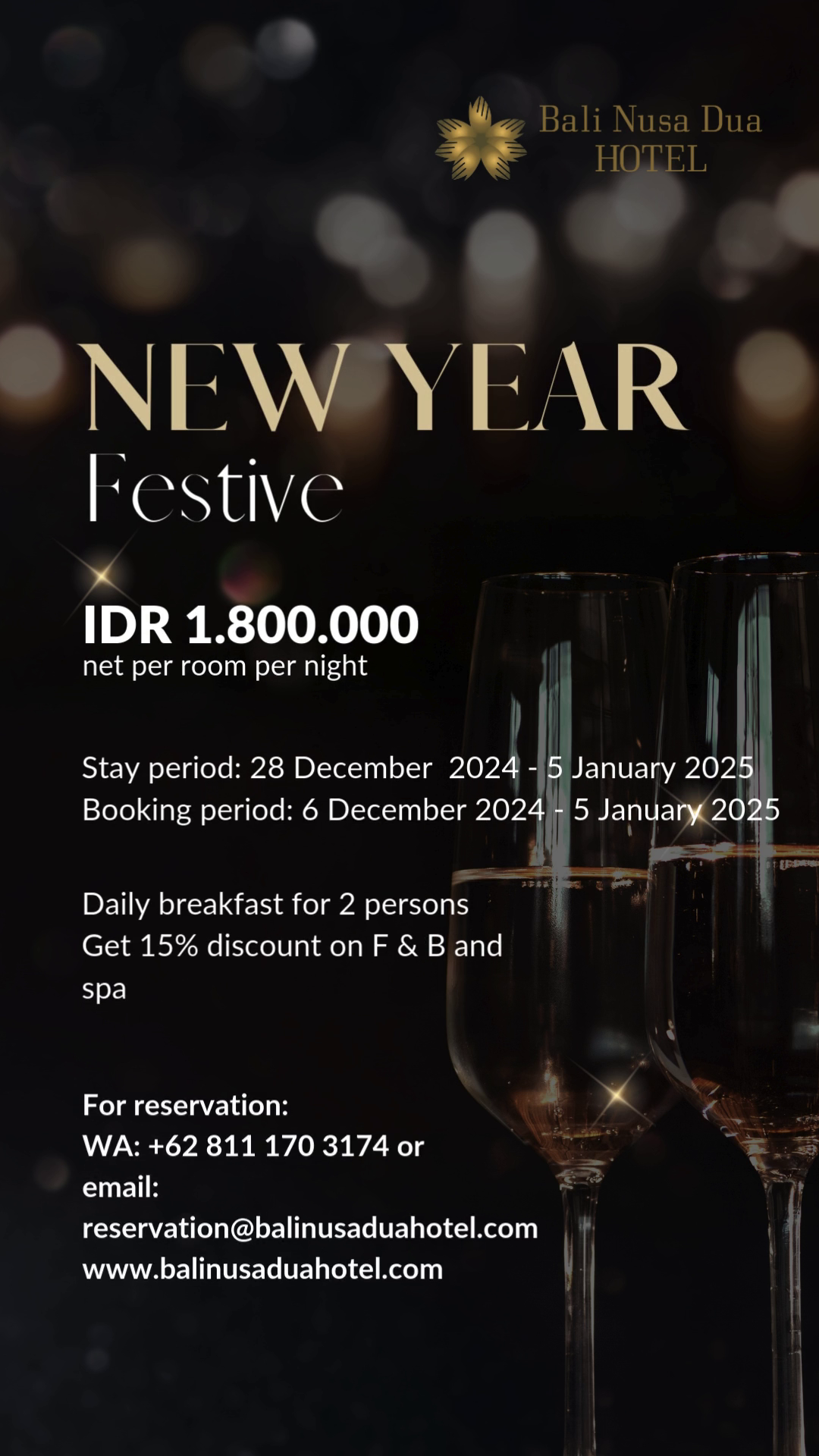 Bali Nusa Dua Hotel NEW YEAR FESTIVE IDR 1.800.000 net per room per night Stay period: 28 December 2024 - 5 January 2025Booking period: 6 December 2024 - 5 January 2025 Daily breakfast for 2 personsGet 15% discount on F & B and spa For reservation:WA: +62 811 170 3174 or email: reservation@balinusaduahotel.comwww.balinusaduahotel.com