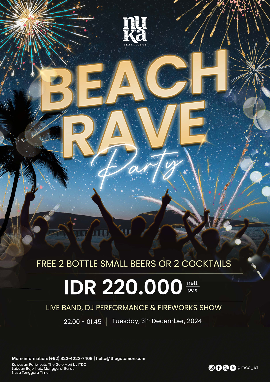 FREE 2 BOTTLE SMALL BEERS OR 2 COCKTAILSIDR 220.000 nett paxLIVE BAND, DJ PERFORMANCE & FIREWORKS SHOW22.00 - 01.45 Tuesday, 31st December, 2024More information: (+62) 823-4223-7409 | hello@thegolomori.comKawasan Pariwisata The Golo Mori by ITDCLabuan Bajo, Kab. Manggarai Barat,Nusa Tenggara Timur